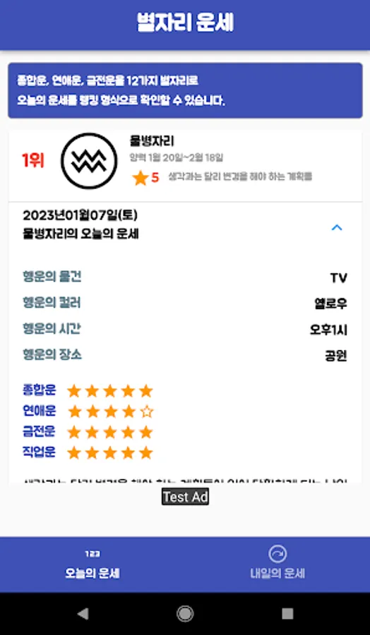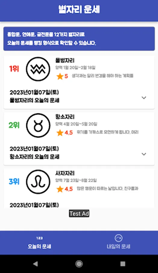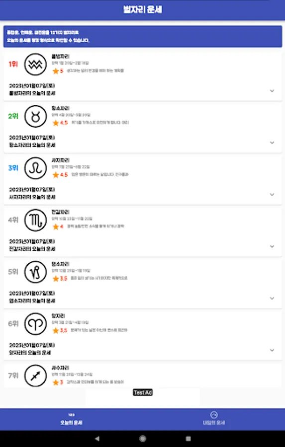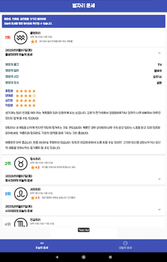 You can check the horoscope of 12 constellations, including overall luck, love luck, and money luck, in a ranking format.