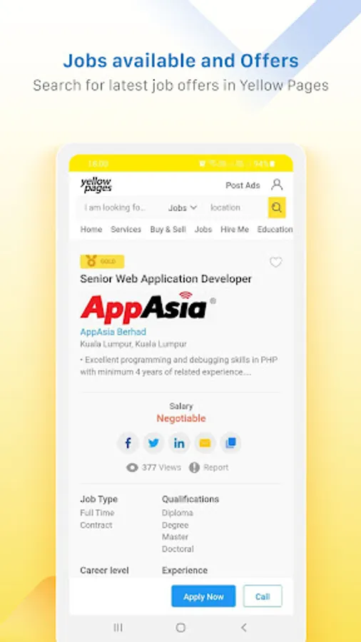 For your lokal search needs. The power of the Yellow Pages Malaysia search engine is now available at your fingertips – anytime, anywhere. Experience a brand new customizable search that has been optimized for mobile.
