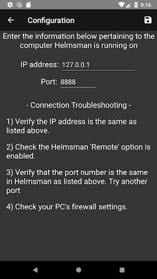 2nd Note: In order to avoid special router settings, forwarding ports, etc... make sure that your device is connected to the same network as the computer running Helmsman.