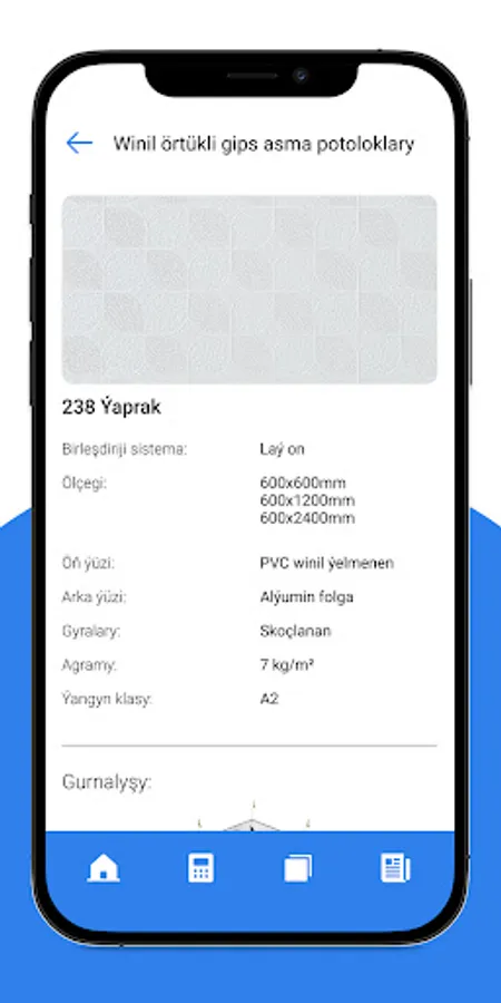 Programmanyň kömegi bilen asma potoloklaryň gurnamasy meýilleşdirilýän ýeriniň ölçeglerini görkezip, potoloklaryň dürli görnüşleri üçin aýratynlykda gerek bolan gurnama önümleriň sanyny hasaplap bilersiňiz.