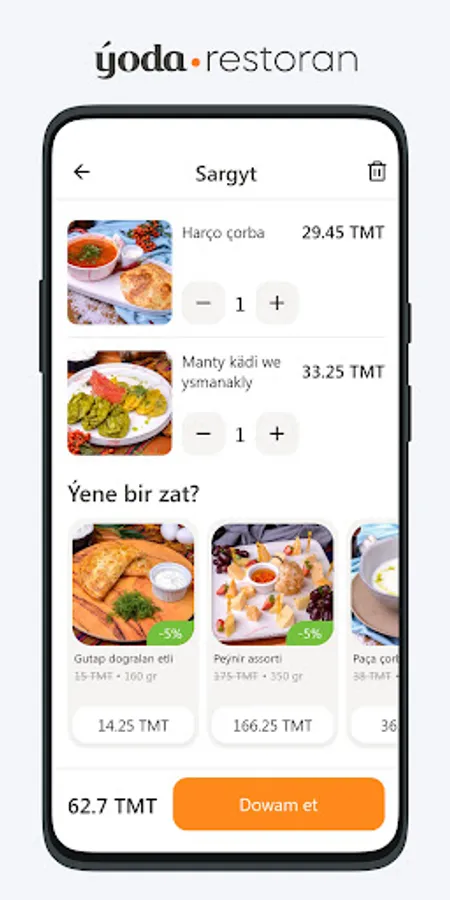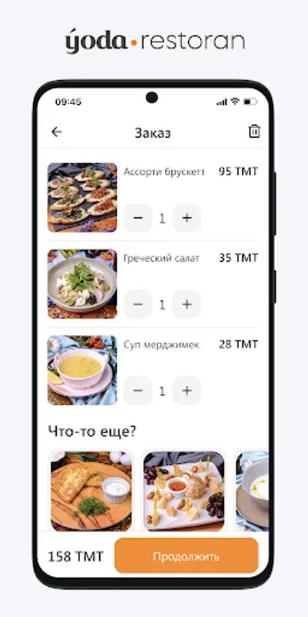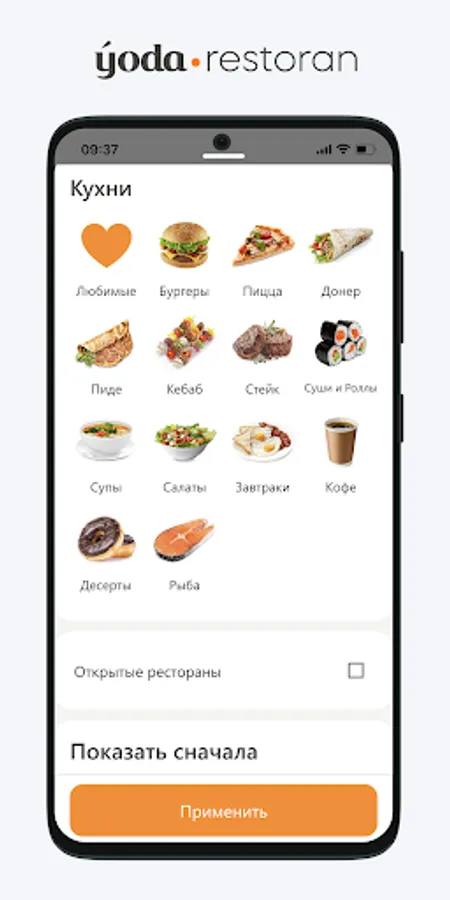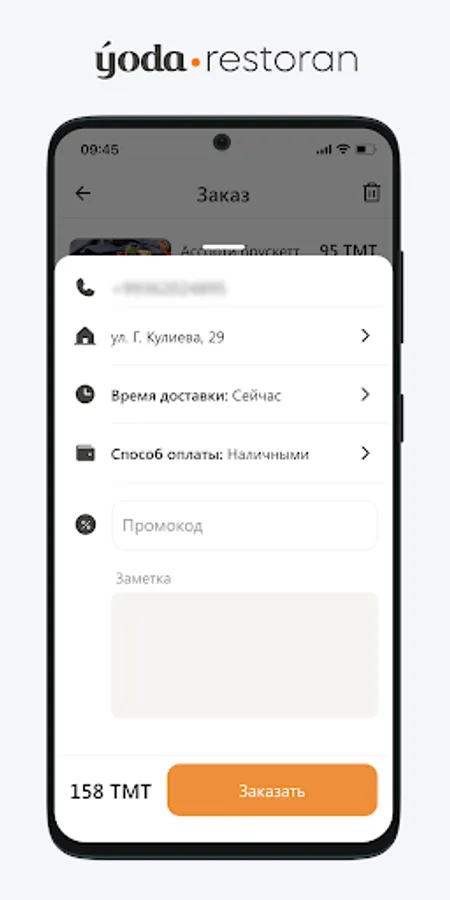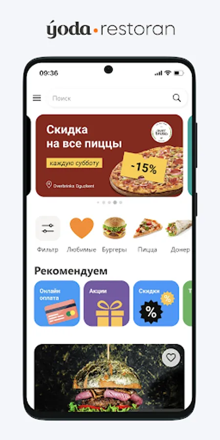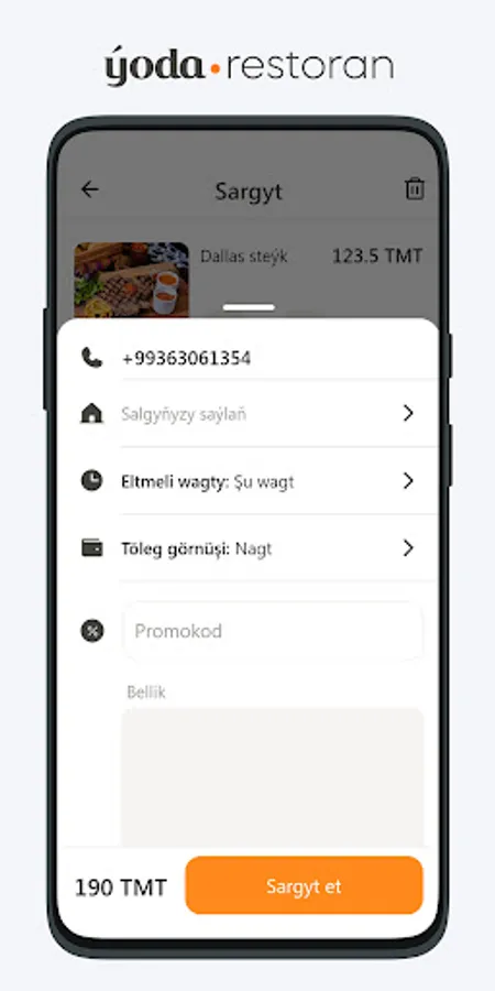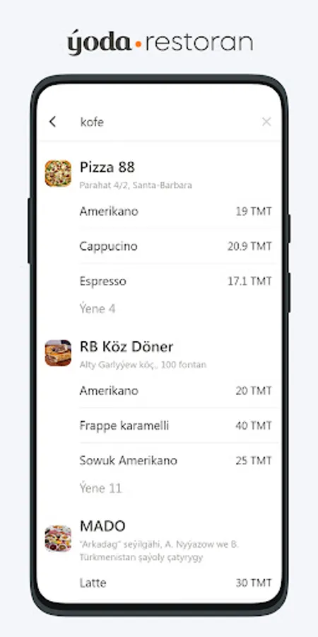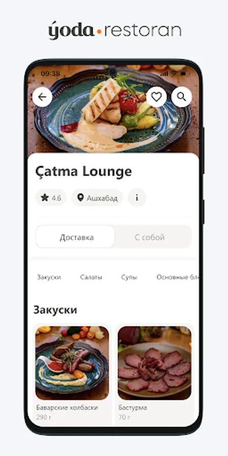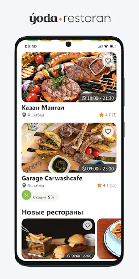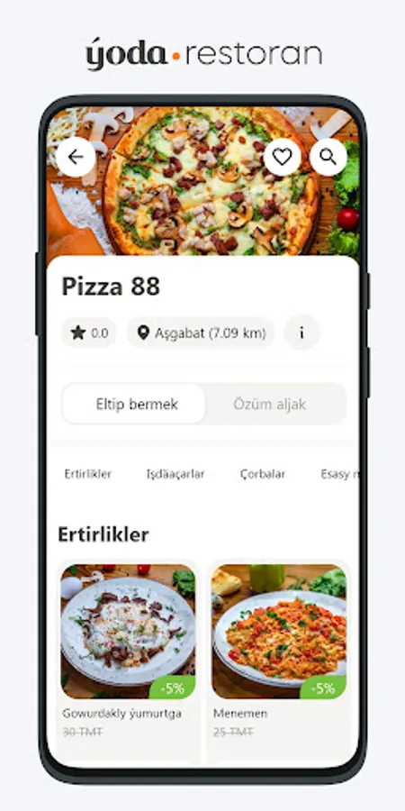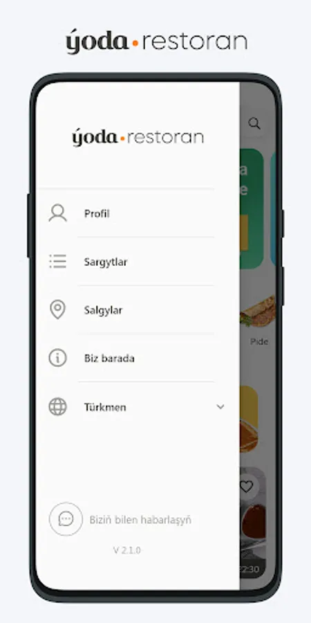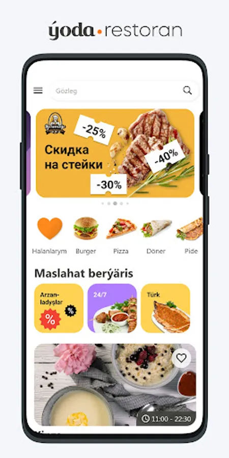 Ýoda Restoran — eltip bermek hyzmaty ýola goýlan restoranlary we kafeleri bir ýerde jemleýän onlaýn platforma. Saýlama restoranlar, aşhanalaryň dürli görnüşleri, ýokary hil, ýokary hyzmat, ulanmak üçin düşnükli interfeýs, sada we göze ýakymly dizaýn, öz maglumatlaryňy goşmak, sargydy iň aňsat usulda jemlemek we salgyňyza gelýänçä “ädimme-ädim” yzarlamak, tagamlar we hyzmat barada pikiriňi ýazmak, öýde nahar bişirmek endigini unutmak… bularyň hemmesi — Ýoda Restoran.