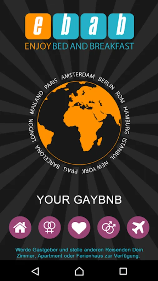 ebab.com was born from the need to provide safe accommodations to gays and lesbians during their trips. To feel welcome, accepted and comfortable with hosts of the community. To be as one is.