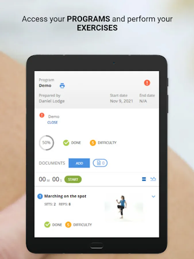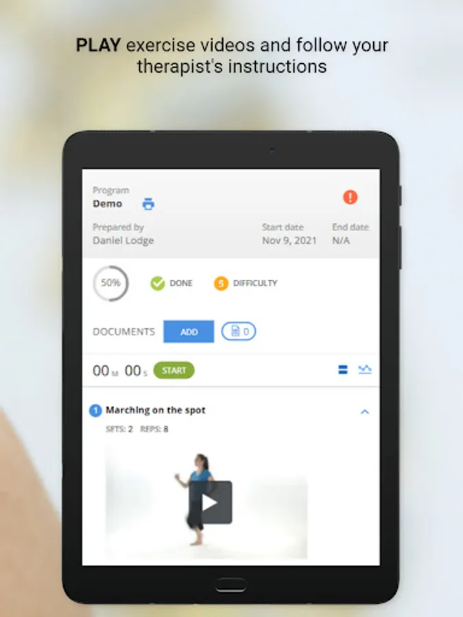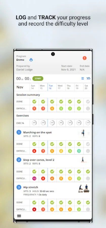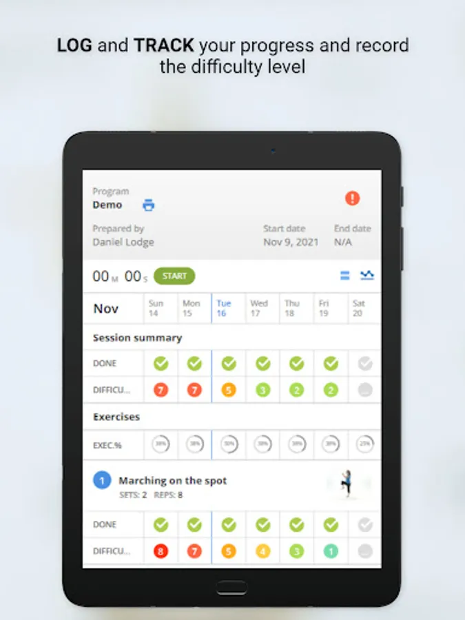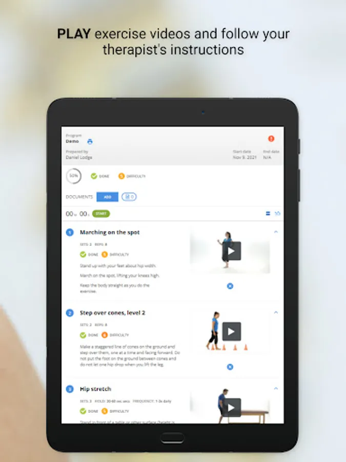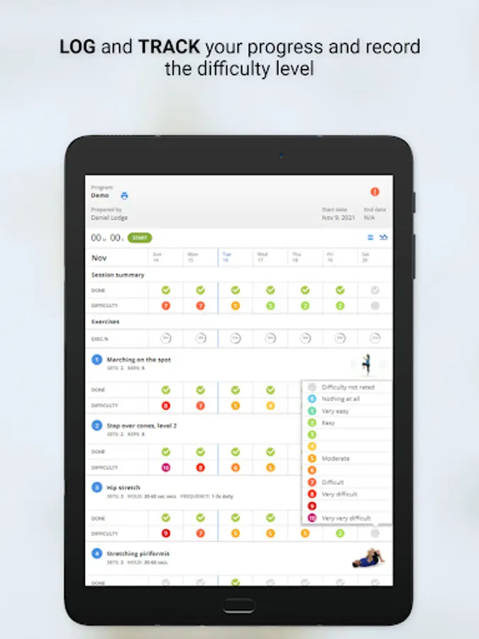 Users can monitor their progress with an interactive rating scale to track exercise completion, exercise effort and pain levels.
