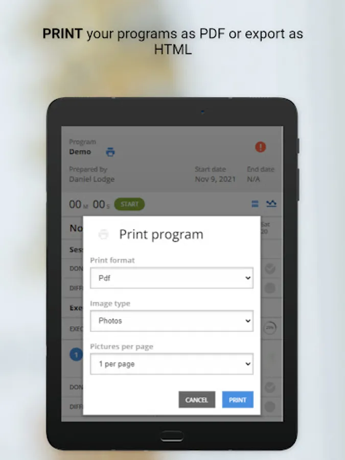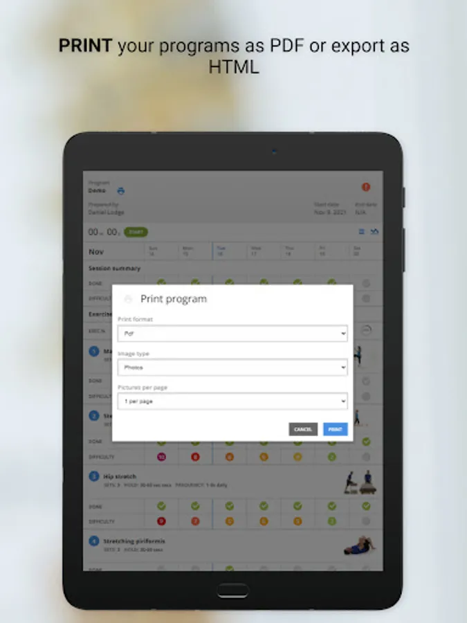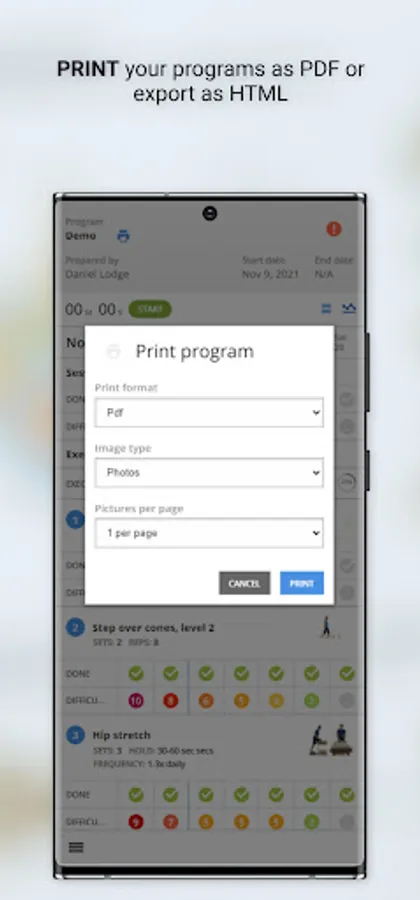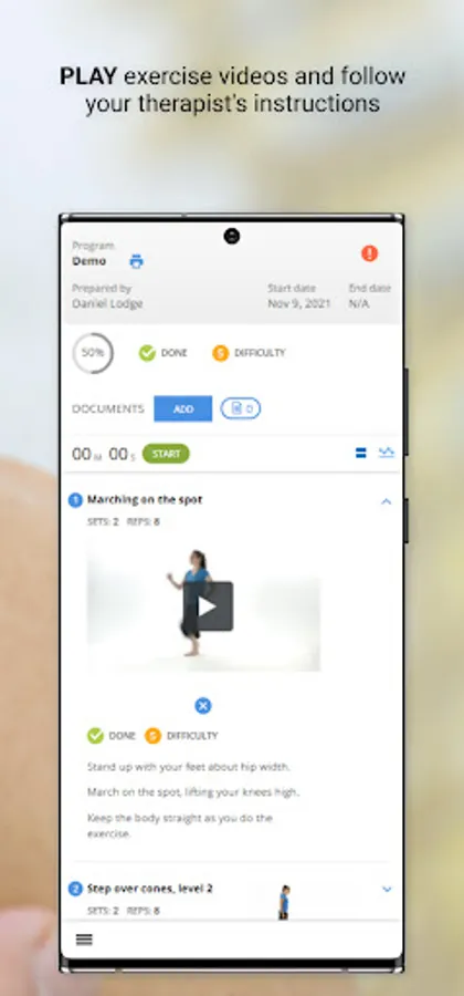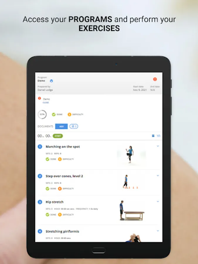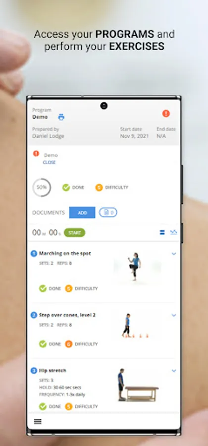 Users can monitor their progress with an interactive rating scale to track exercise completion, exercise effort and pain levels.