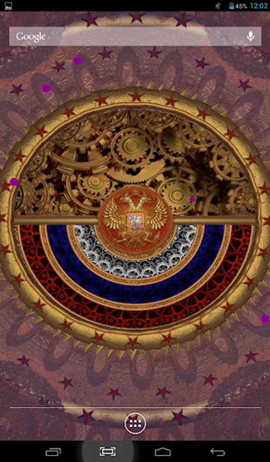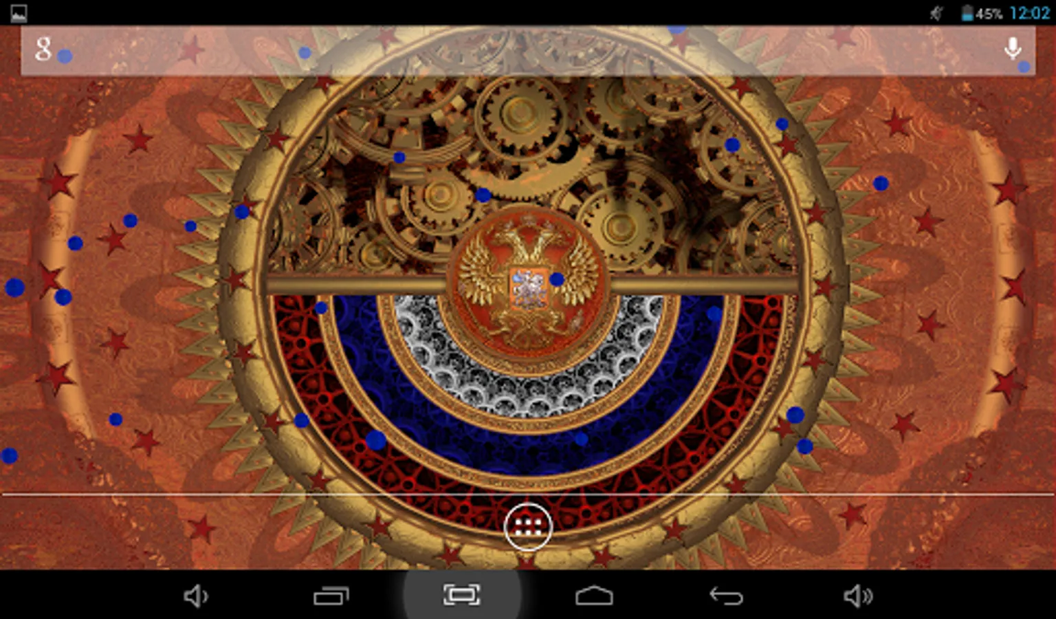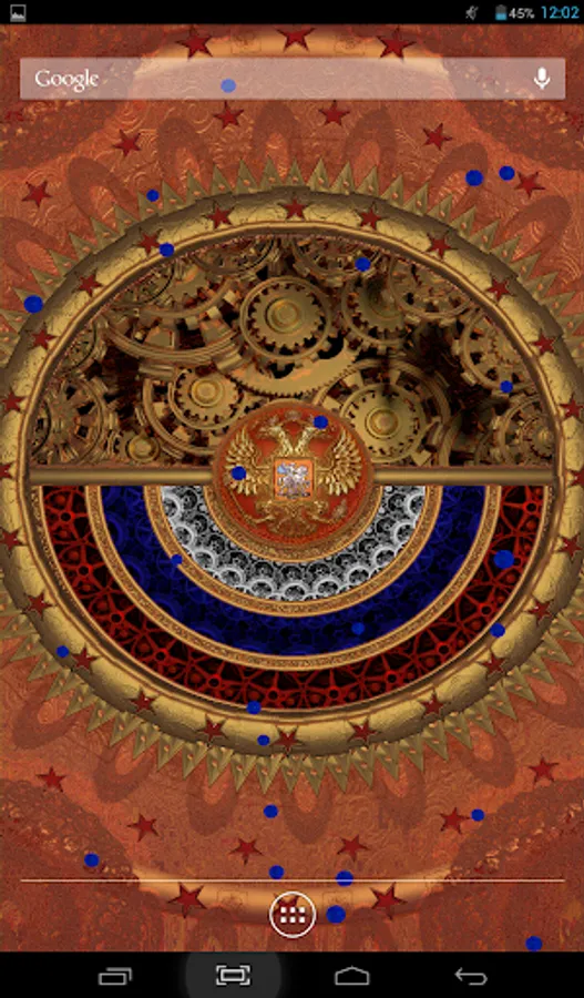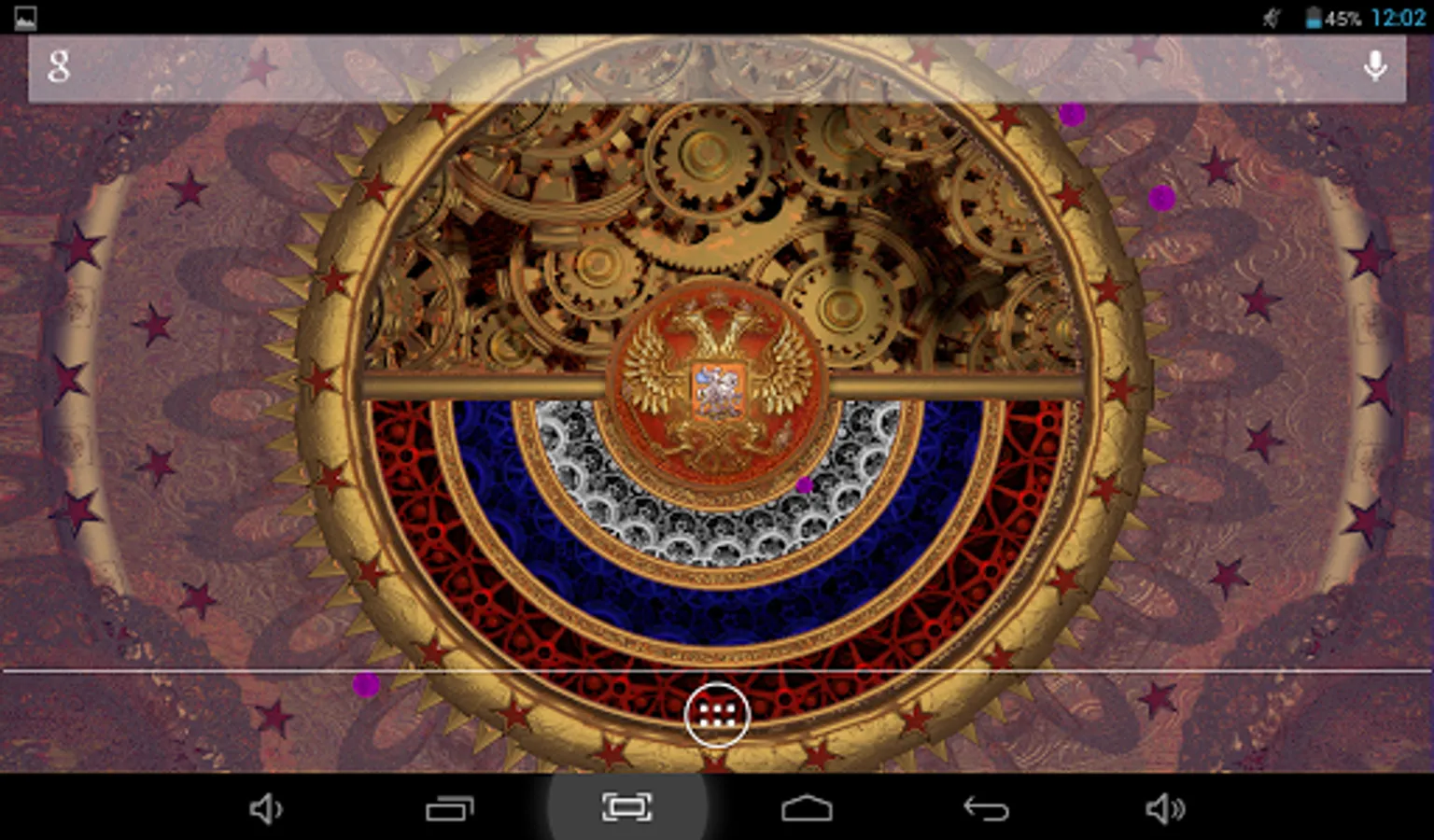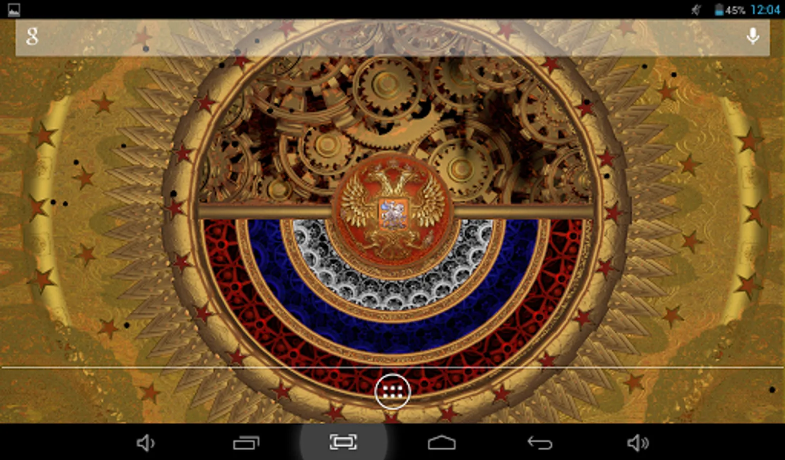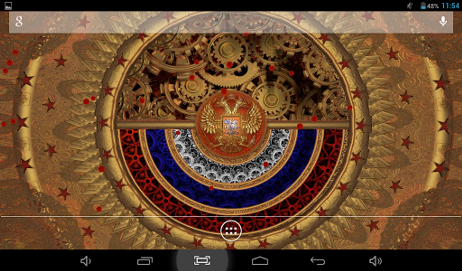 Russian coat of arms, rotating gears, needles and clock function. You can choose color of background plate, number of needles and speed of it rotation, color, number and type of behavior of dust, flying above. Beautiful and original wallpaper for your device!