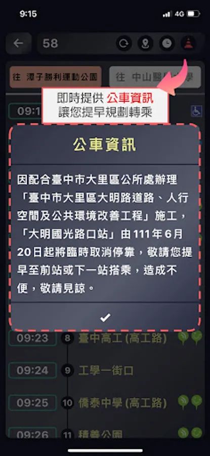 9. MRT bus information: Displays bus routes and dynamic information near Taichung MRT Station.