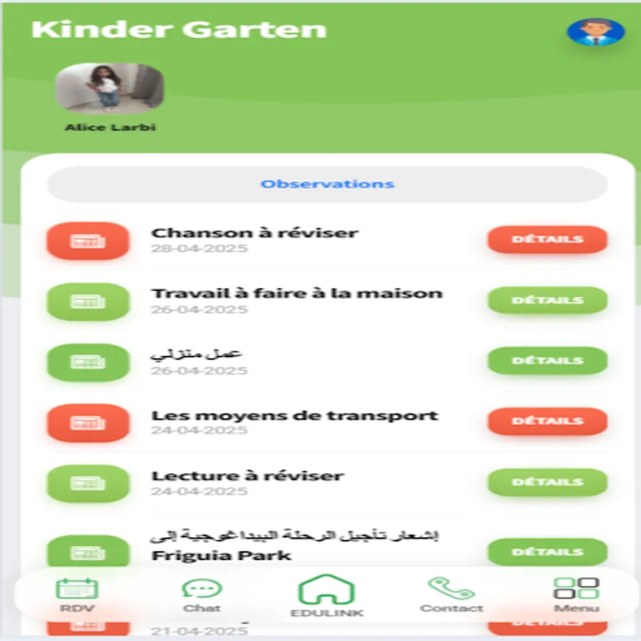L'application Kindergarten mobile permet au parent d'être à côté de son enfant: suivre les activités pédagogiques, recevoir des conseils du cadre de l'école, être à jour pour les évènements culturels et sportifs. Contacter l'administration de l'école, recevoir les bulletins des notes, ....Kindergarten Mobile c'est être informé là où vous êtes... Cher parent Kindergarten télécharger Kindergarten Mobile et entrer votre identifiant et mot de passe disponible par sms ou à l'administration de l'école.