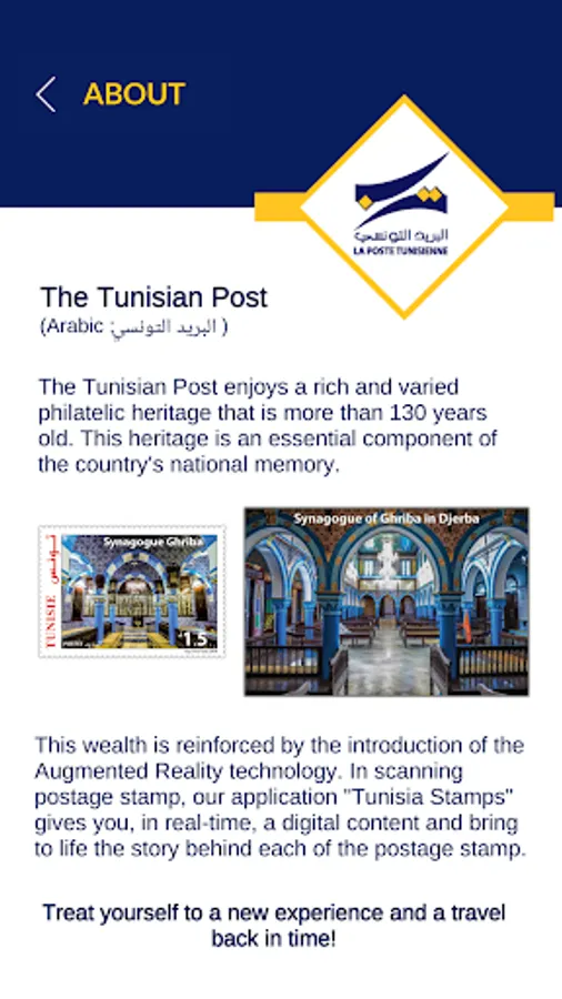 The Tunisian Post enjoys a rich and varied philatelic heritage that is more than 130 years old. This wealth is reinforced by the introduction of the Augmented Reality technology. Our application "Tunisia Stamps" gives you, in real-time, a digital content and brings to life the story behind each of the postage stamp.