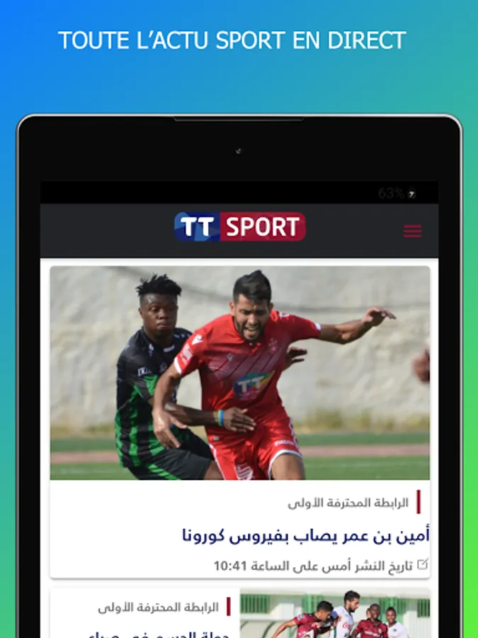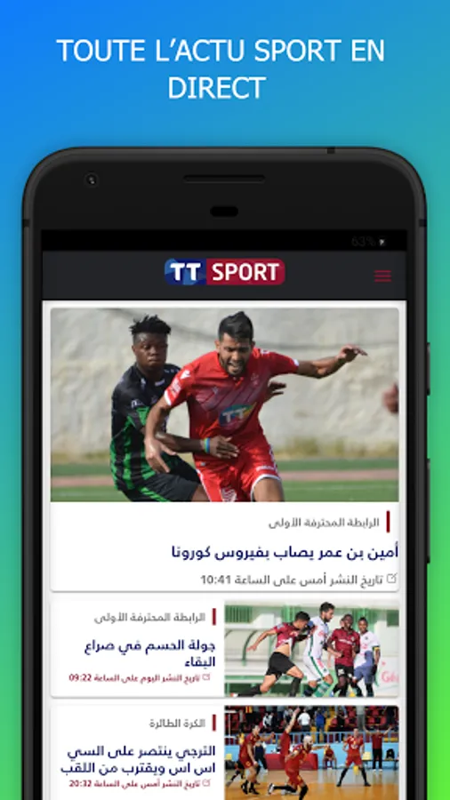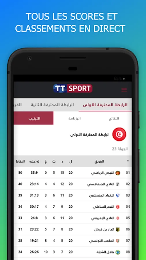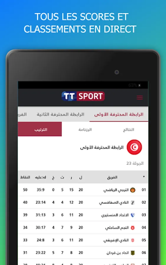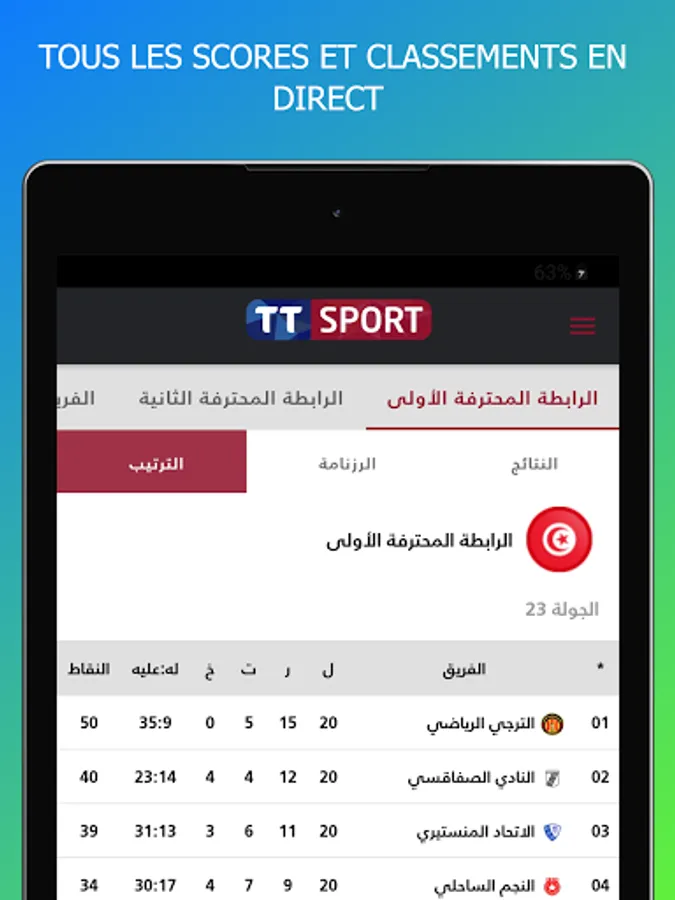 With TTSport, find all sports news with live calendars and rankings, all results and follow-ups of Tunisian competitions as well as the biggest sports competitions in the world.
