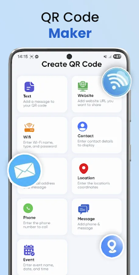 Easy QR code creation: Generate different types of QR codes such as website links, emails, phone numbers, Wi-Fi, and events.
