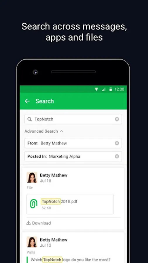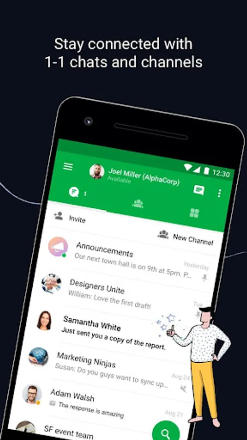 - Communicate with colleagues and entire teams through 1-on-1 chats and group messaging