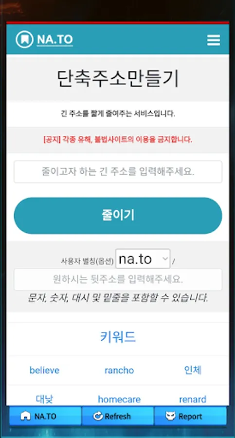 NA.TO is your own fixed and dynamic domain service that easily shortens long addresses such as homepages, cafes, blogs, Facebook, Instagram, and SNS. Now shorten long web addresses (URLs) to NA.TO without having to remember them! Try a new experience of enjoying the Internet with convenient shortcut links.