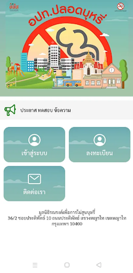 Faculty of Public Health Mahidol University Faculty of Public Health Ramkhamhaeng University National Statistical Office and the Non-Smokers Campaign Foundation, supported by the Thai Health Promotion Foundation on behalf of the evaluation team. In the project to assess the strength of the policy and measures to control tobacco consumption of the Campaign for No Smoking Foundation. developed this application for local government organizations It was used to survey situational data related to smoking behavior. smoking cessation and compliance with the laws of the place where tobacco products are sold. and public places in order for the local government to have a database for use in developing, monitoring, and supervising the success of tobacco control operations at the area level.