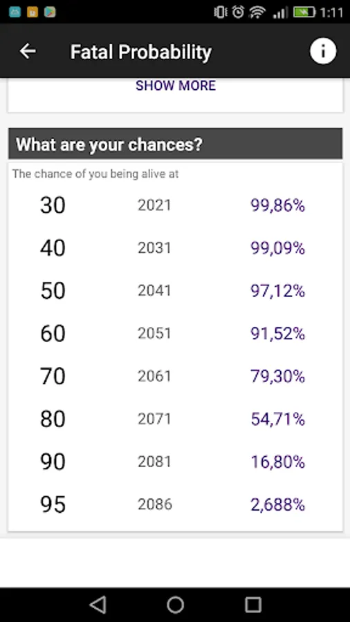- Probability that you will be alive at your 20, 30, ... 70, 80,..