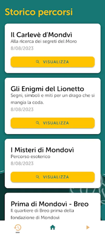 On the same application there will be fixed game paths and other temporary ones that will take place in different places. Each path will be signed by an author and will have a specific genre. The first three game paths are: temporary path in Mondovì "il Carlevè d'Mondvì", signed by Marco Tomatis and dedicated to the Monregalese carnival mask; fixed itinerary "The Mysteries of Mondovì", signed by Lorenzo Barberis and dedicated to the esoteric aspects; fixed itinerary in London "The places of the Harry Potter films", signed by Francesco Ponzo.