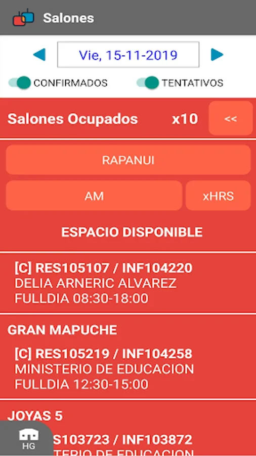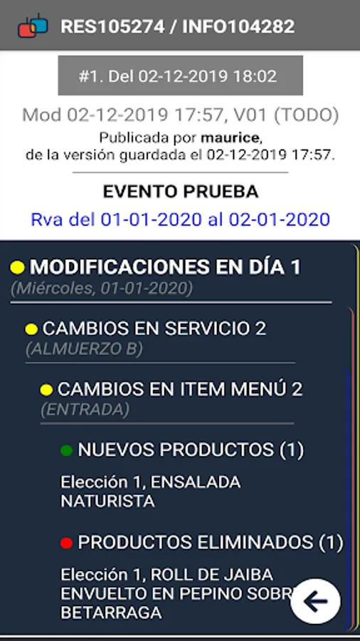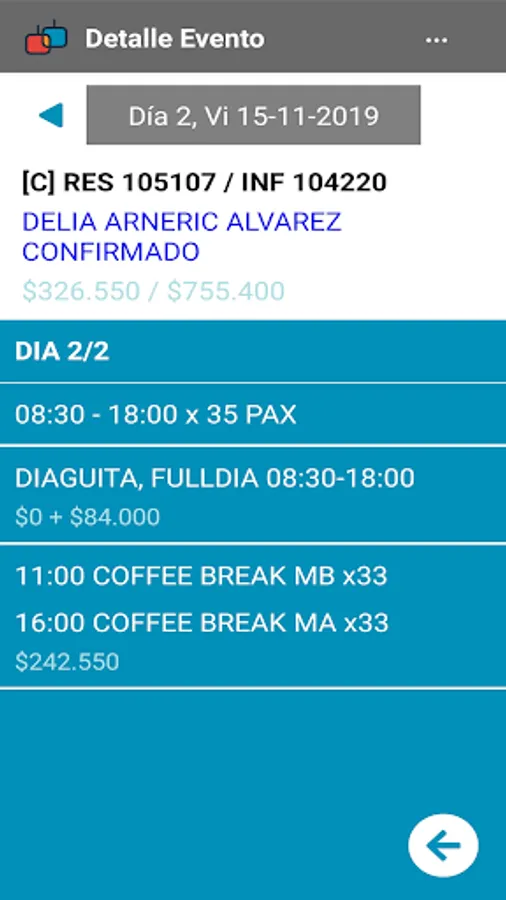Depending on the user's profile, you can access the confirmed and tentative events for some date and see their details (from schedules, attendees, assembly of rooms and equipment requirements, to the menus of the various food and beverage services).