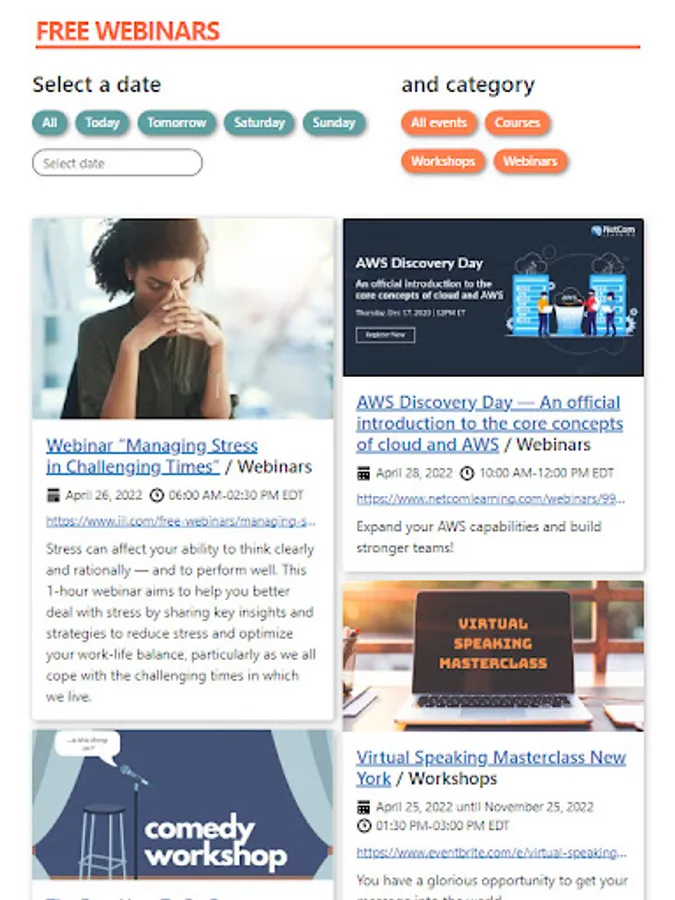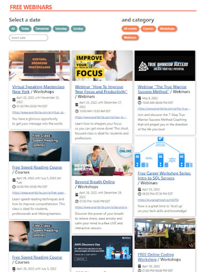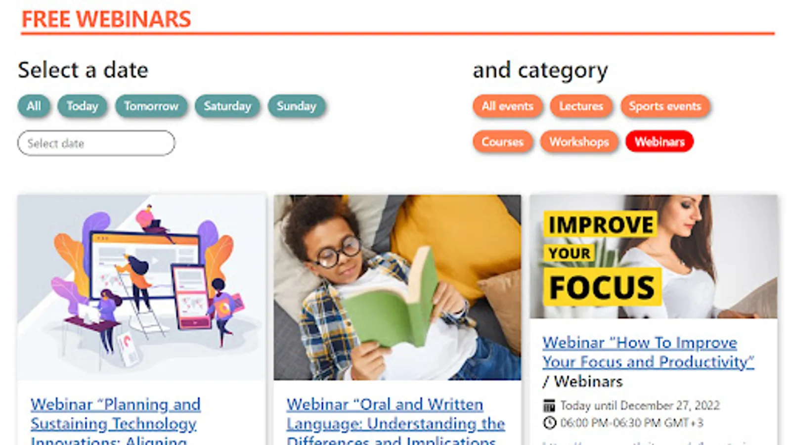 Nowadays, learning, developing, and self-improving are more accessible than ever. You will always be up to date with all free online events - webinars, masterclasses, courses, and more.