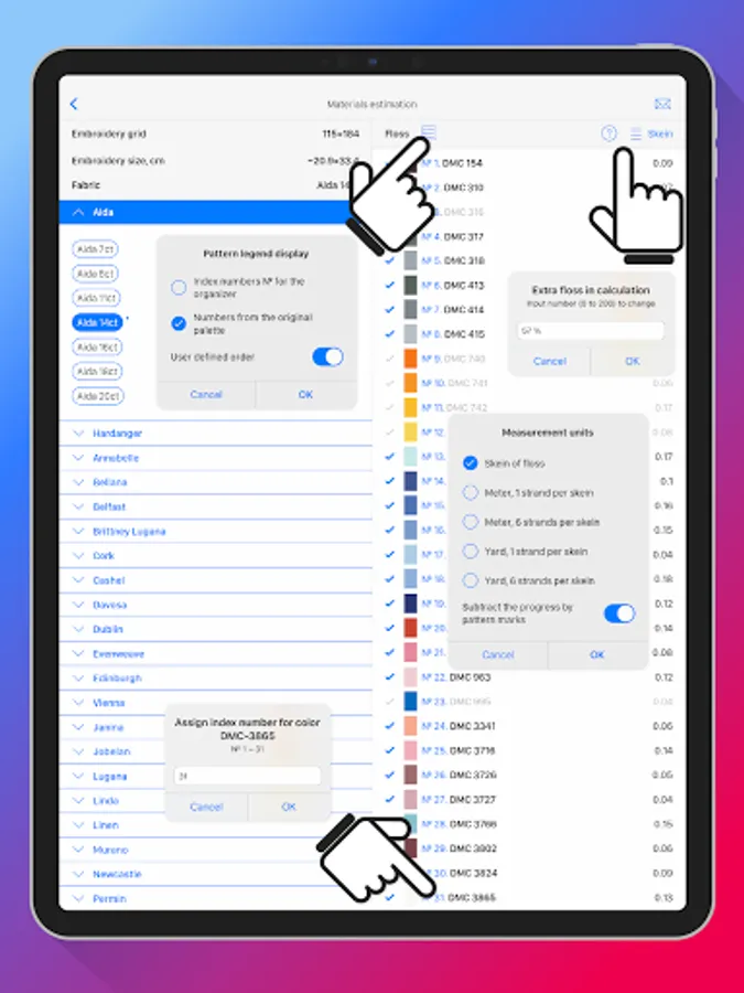 ✔️Use the built-in calculator to estimate materials (fabric, floss, and beads)