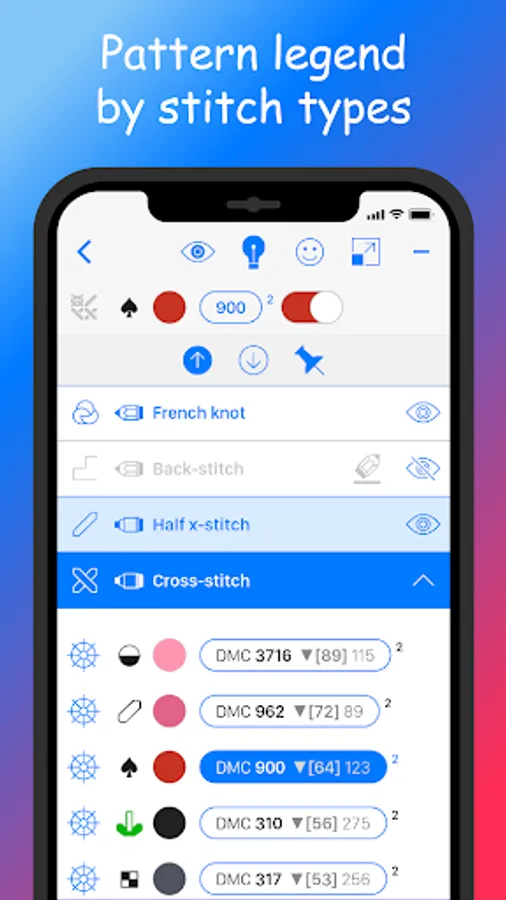 ✔️Instantly get all the information about each pattern element (type, color, number of threads, blended floss content)