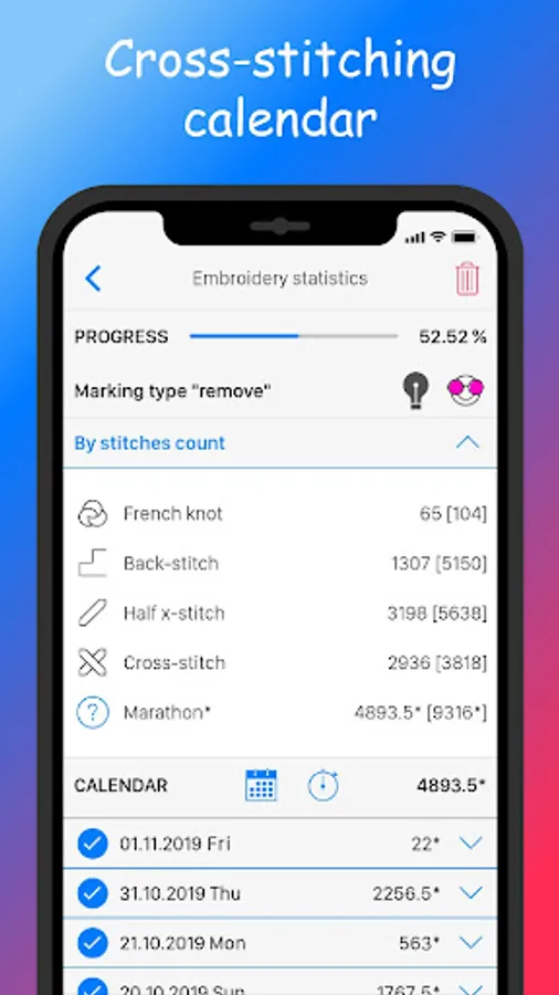 🧶The application keeps a detailed calendar of cross-stitching statistics on your markups in the pattern.