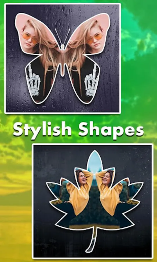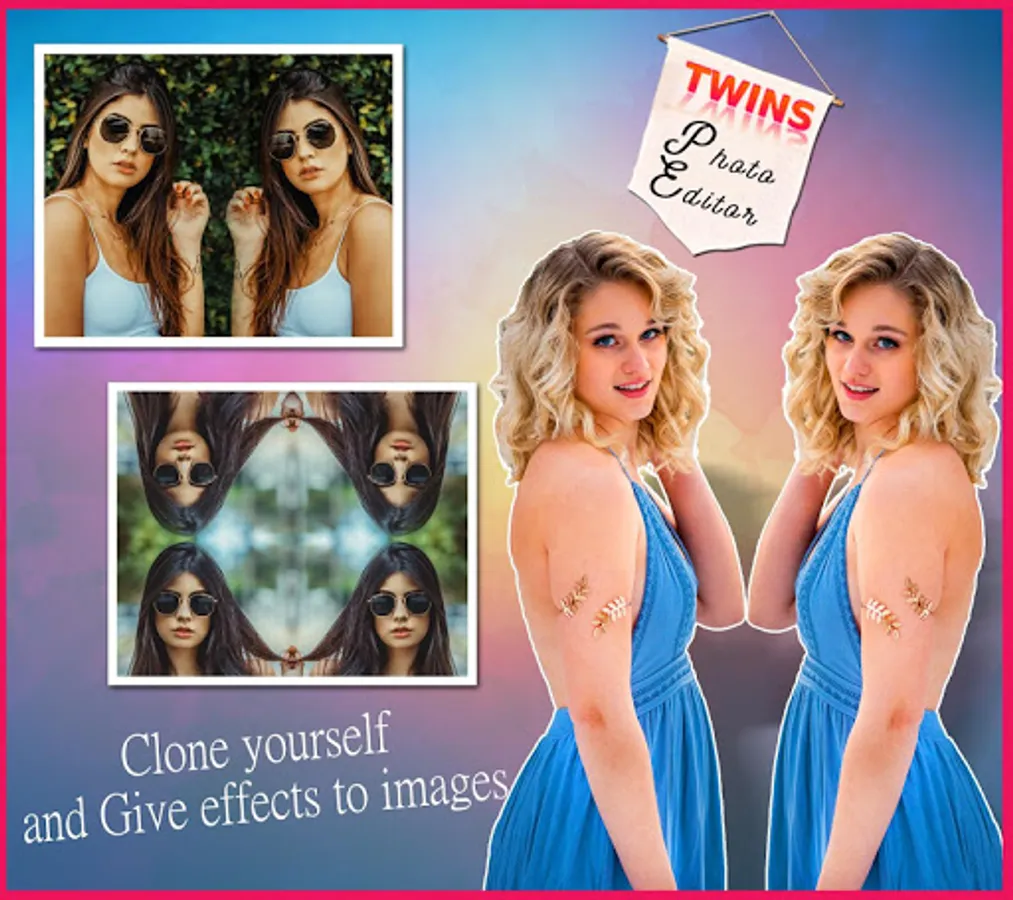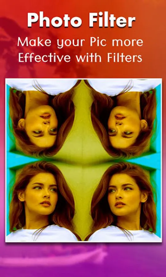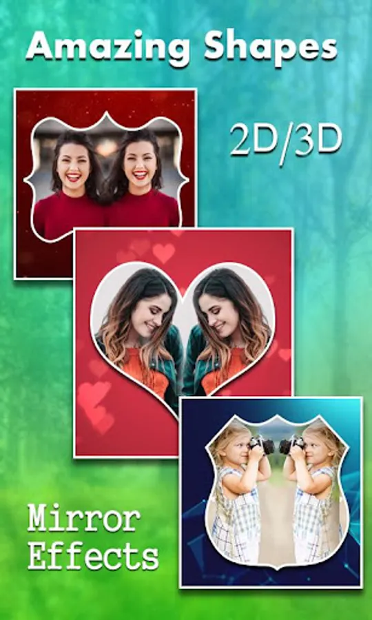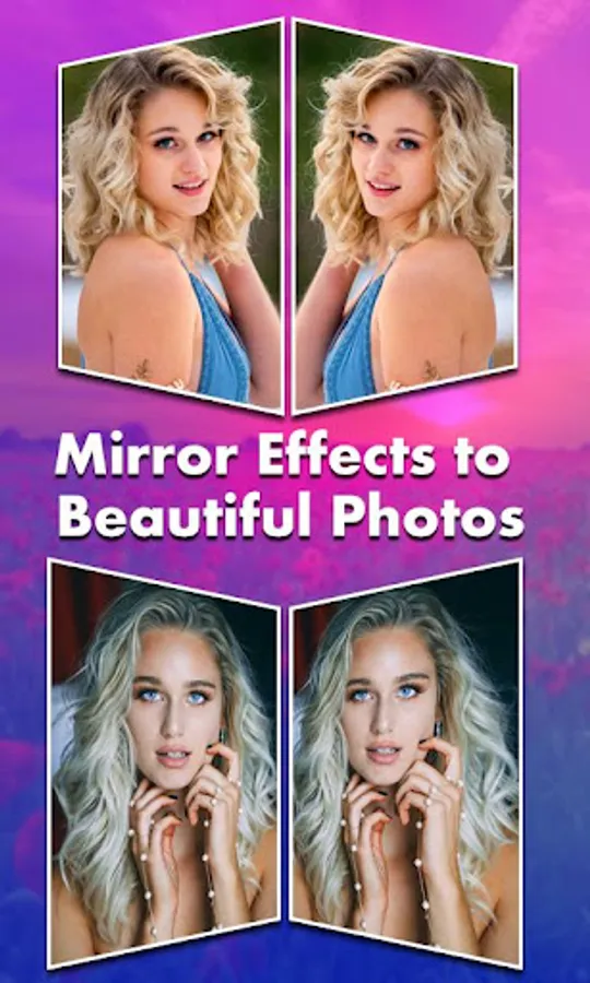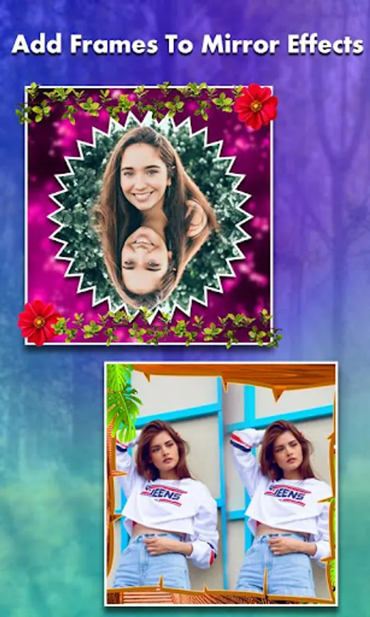 it create two pictures in one. it allows you to create mirror effect with your photos. You can create left -right, up - down, reflection. You can Apply several photo effects and photo frames to these mirror photos.