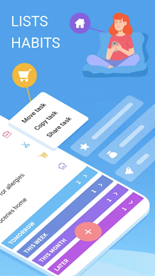 Neat and intuitive interface will make the use of the app as convenient and pleasant as possible: all that matters (tasks, lists, schedule, habits) will now always be at your fingertips on one screen. And adding or editing new tasks or notes will be quick and easy.
