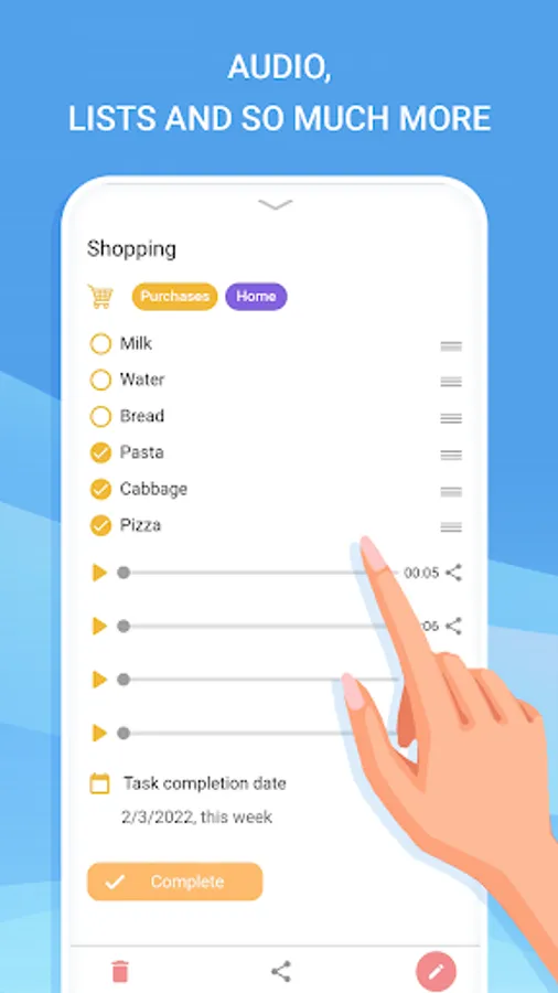 Add lists of subtasks and shopping lists, to-do lists and check-lists, interchange items and mark completed or purchased items to make sure your lists are always up-to-date.