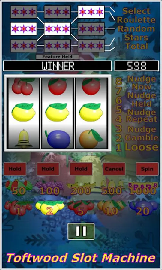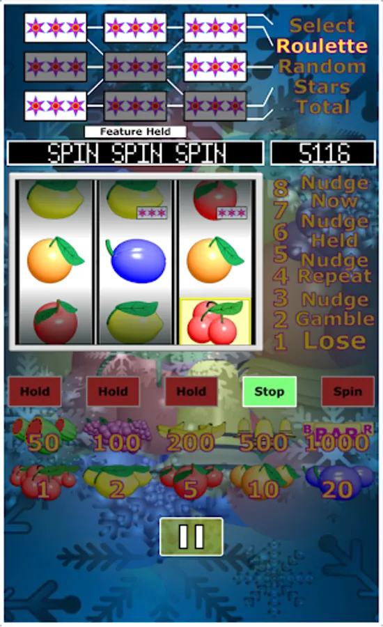 1/. Select: Select a win. A series of wins are spun in, you have to stop the machine on one.