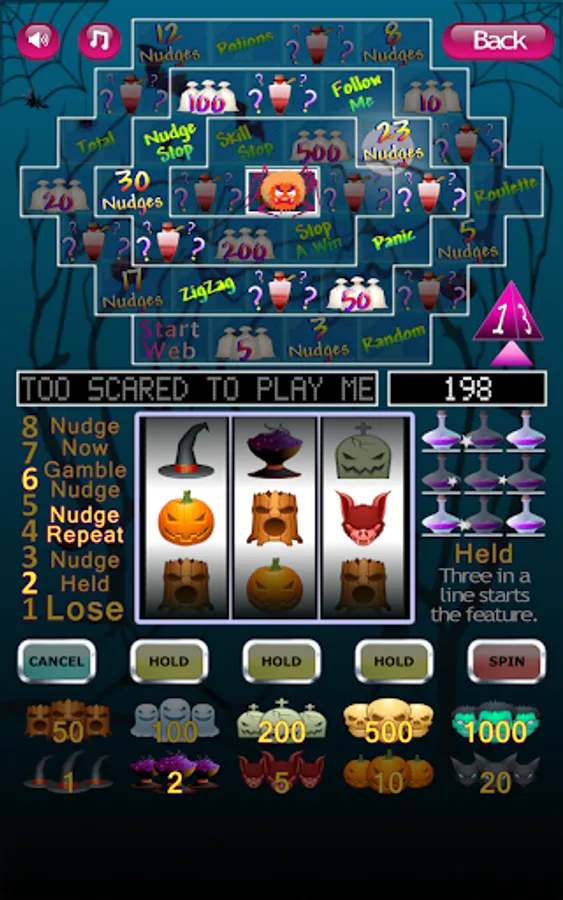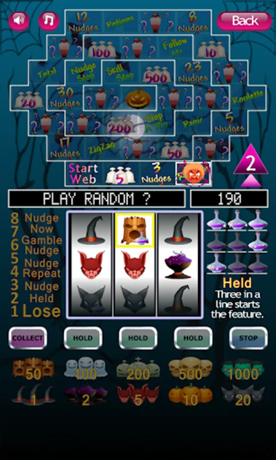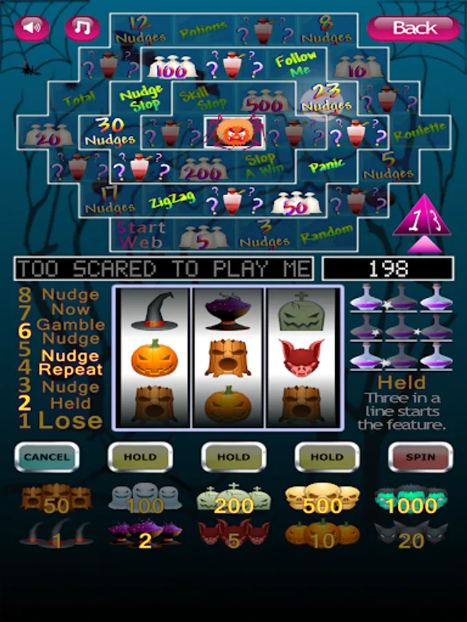 Reach the pumpkin in the center of the web to get the jackpot with a repeat change..