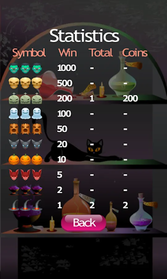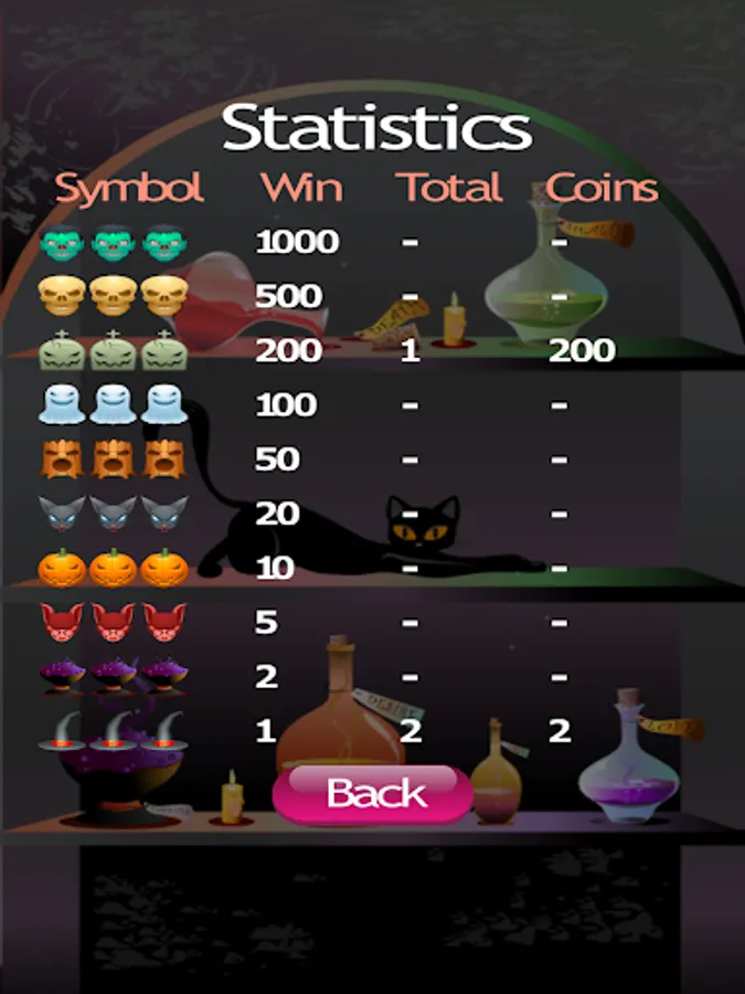 A statistics screen is included to see how many times you have won. Press the flashing red spin button to start the spooky Halloween slot machine reels moving. We wrote this spooky Halloween slot machine so you can have fun playing a slot machine without gambling real money. Thank you for downloading and playing our spooky Halloween slot machine.
