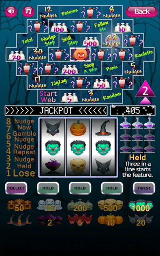 Three potions in a row in any direction starts the spooky Halloween slot machine feature.