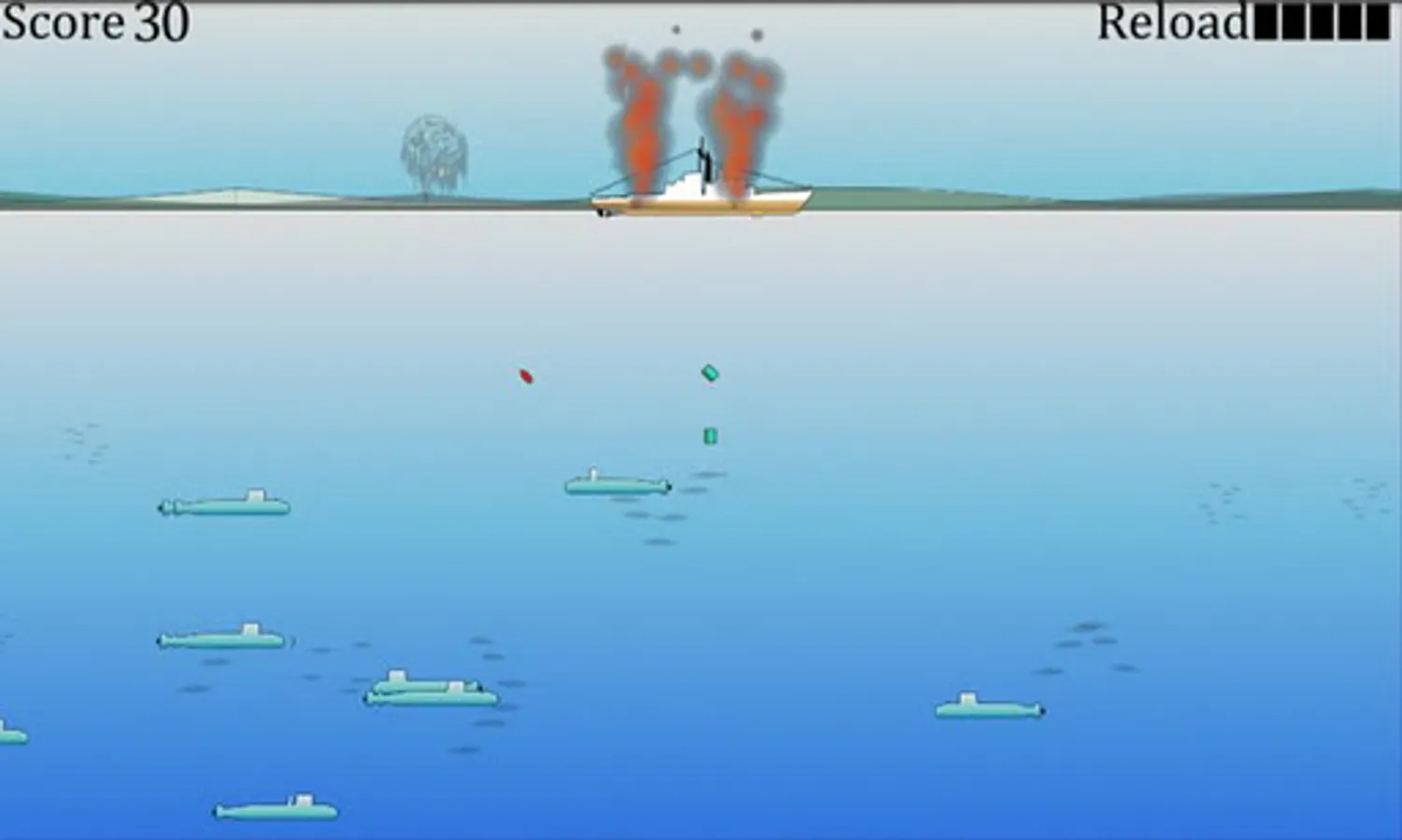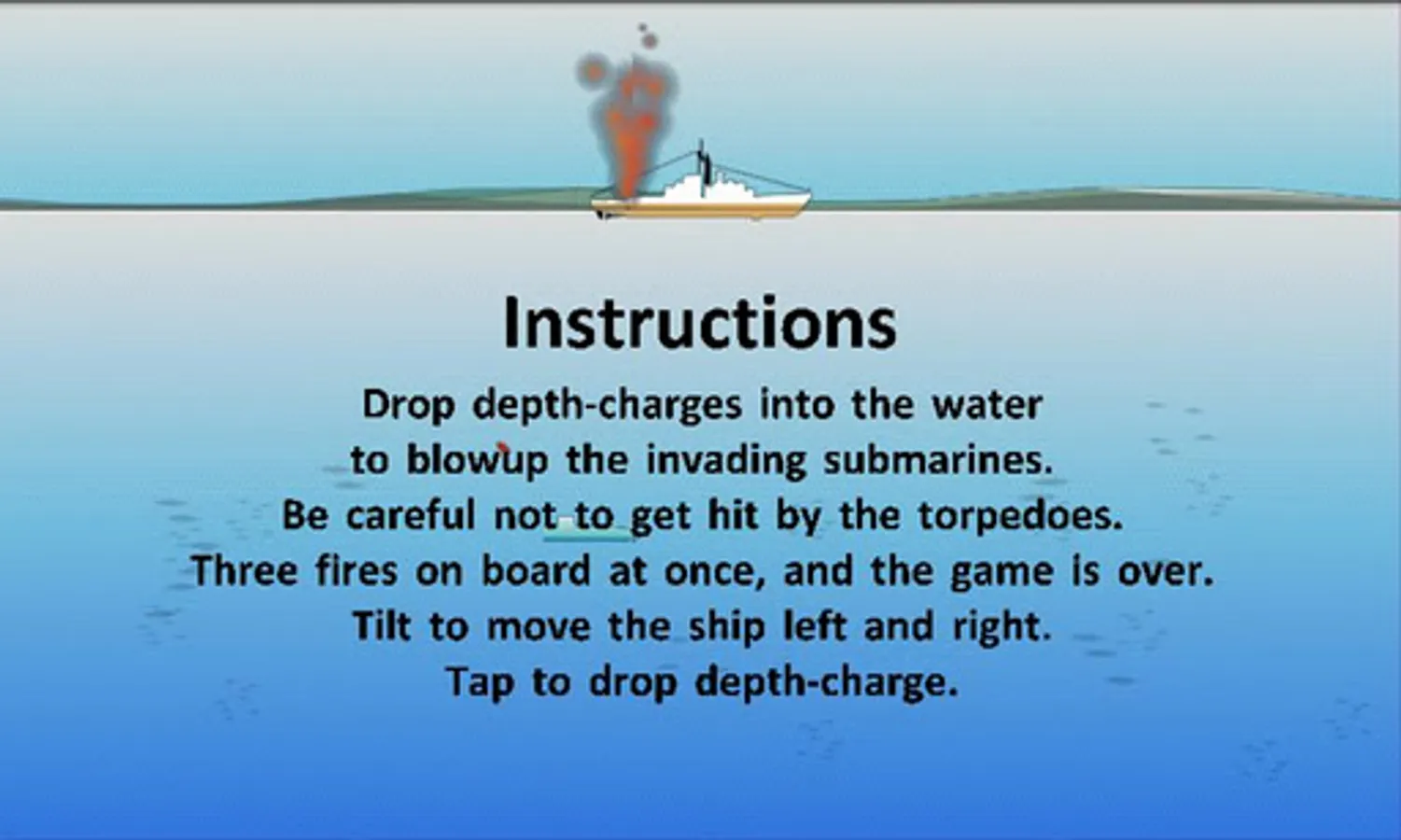 Drop depth-charges into the water to blowup the invading submarines. Be careful not to get hit by the torpedoes. Three fires on board at once, and the game is over. Tilt to move the ship left and right. Tap to drop depth-charge.