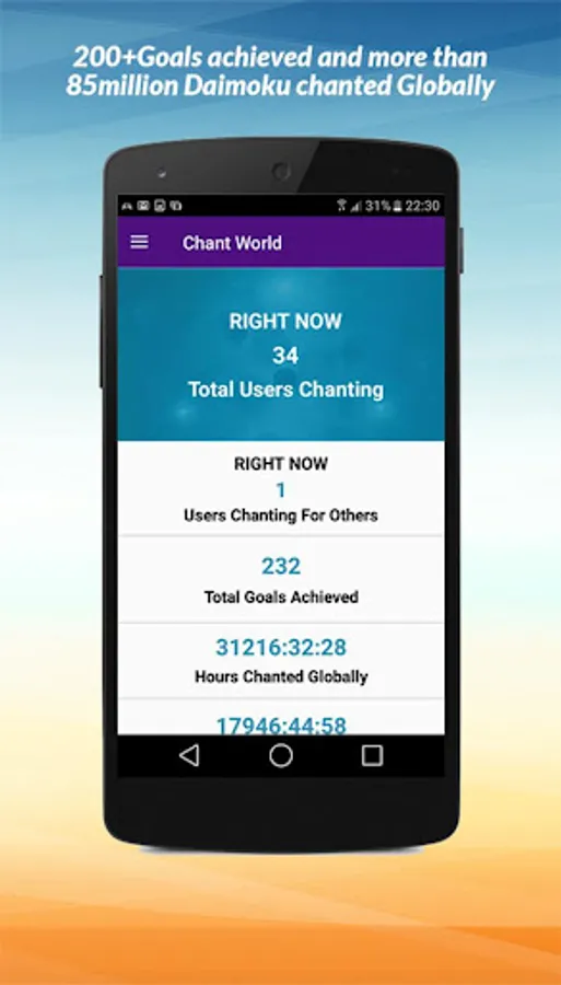 The Chant World allows you to view real time data related to worldwide chanting: number of users chanting right now, number of users chanting for others, number of hours chanted globally, number of hours chanted for others, Global victories achieved etc.