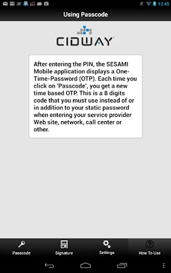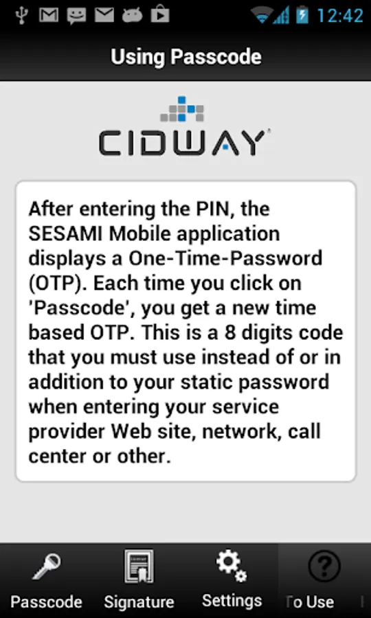 CIDWAY SESAMI Mobile One-Time-Password (OTP) mobile application provides a time based 2-factor authentication solution for any remote access, protecting from hacking and theft. The OTP is unique for each transaction and can’t be re-use.