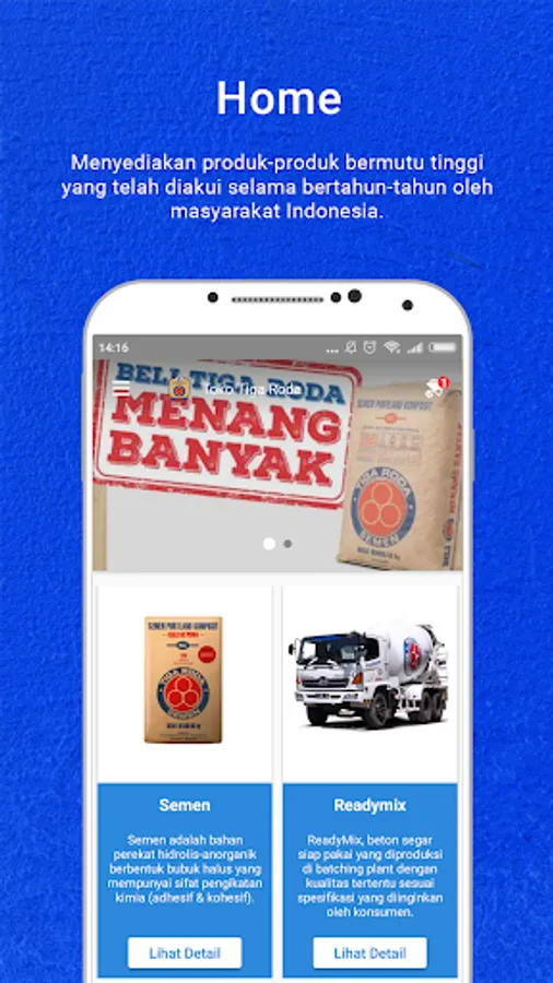 Toko Tiga Roda (www.tokotigaroda.com) adalah penyedia layanan penjualan bahan bangunan berkualitas khususnya semen dan beton siap pakai (Ready-Mix) di Indonesia dengan platform E-Commerce. Layanan kami memberikan kemudahan bagi pelanggan untuk melakukan pembelian produk bahan bangunan bermutu cukup dari genggaman tangan.