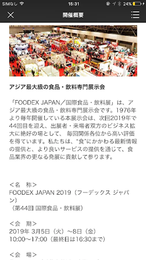 2019年3月5日(火)~8日(木)に幕張メッセで開催される、アジア最大級の食品・飲料の専門展示会「FOODEX JAPAN」の来場者向け公式アプリです。