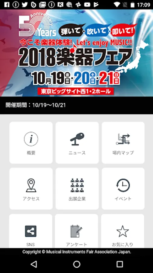 本アプリでは「楽器フェア」誕生50周年の記念イベント情報をいち早く公開、又楽器メーカー一押しの新製品、ブース内デモ演奏等新着情報、スケジュールの確認をすることが出来ます。又マイページからの登録イベント、コンサート情報等の確認をすることが出来ます。