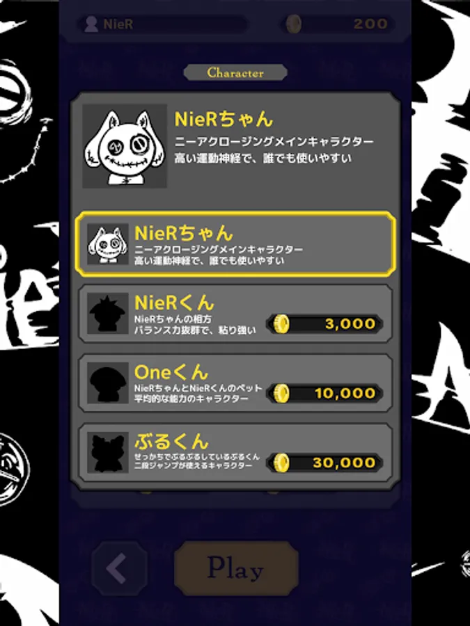 初期設定ではNieRちゃんのみしか選択できませんが、ゲーム内でもらえる無料のゲームマネーを使用することでキャラクター選択が可能です。