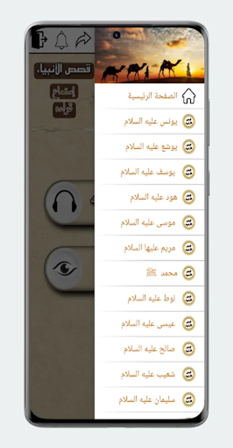 The main page of the application contains a group of famous Islamic prophets such as: Noah, Abraham, Moses, Jesus, Muhammad and others. Users can click on the name of the Prophet to view his story in detail.