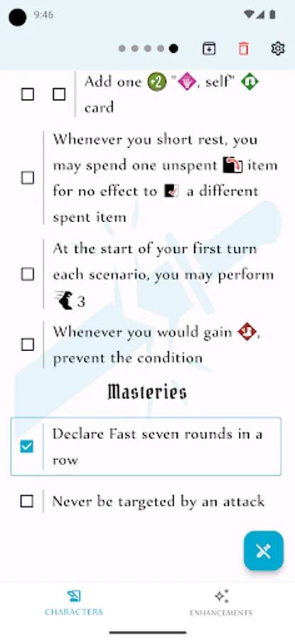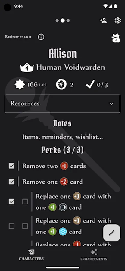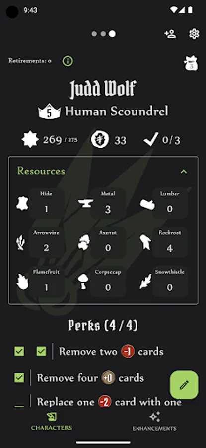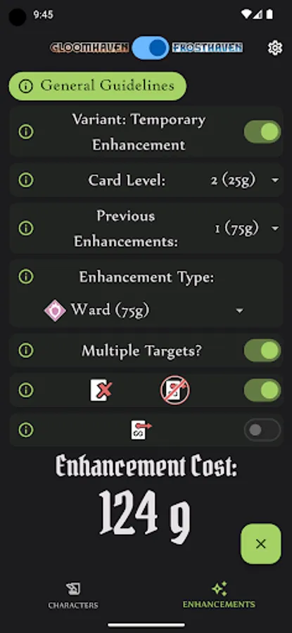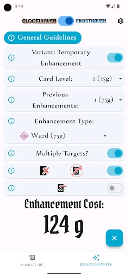 Track the progress of multiple characters using the digital character sheets or easily figure out the cost of a card enhancement using the Enhancement Calculator, which provides details on each enhancement, associated cost, and various modifiers to the cost. Options for both Gloomhaven and Frosthaven rules, as well as support for the new 'Temporary Enhancement' variant rule.