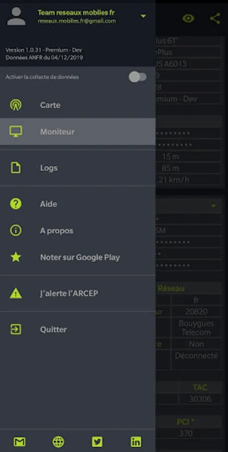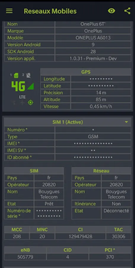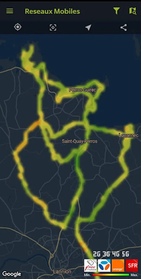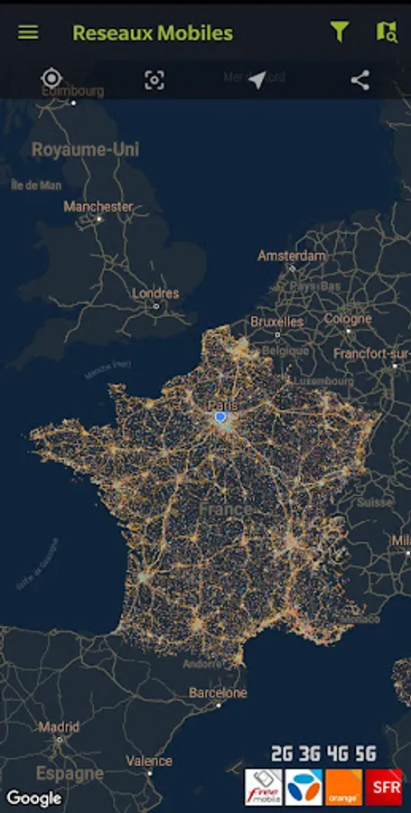 The app also offers mobile coverage map your own (from the level recorded the signal received by your phone) and share this data to a mobile network coverage map in France (crowdsourcing).