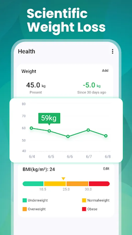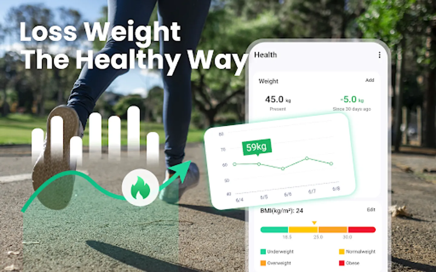 - Health tracker app records your health data (walking Steps, Calories, walking time, walking distance, weight trends, BMI, etc.)