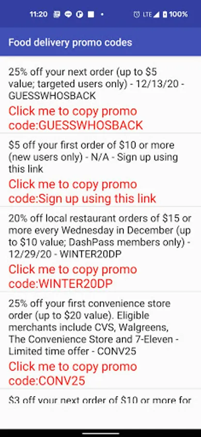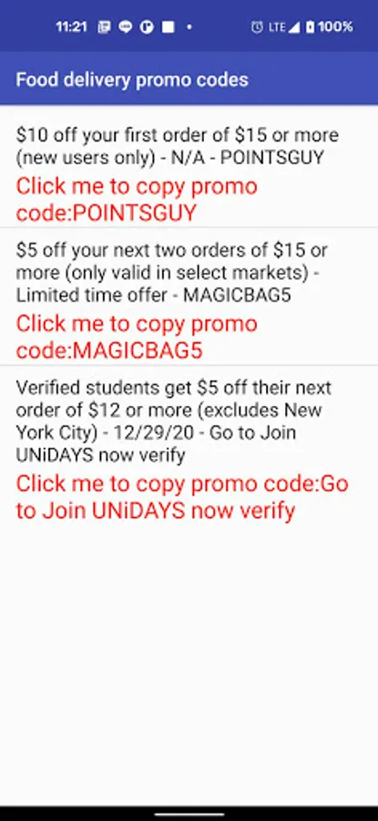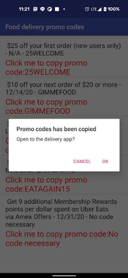 Quickly update the promo codes to you in time, just click the code, it will directly copy it and bring out delivery app for using it.