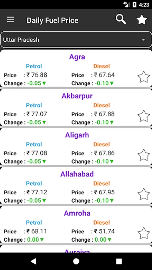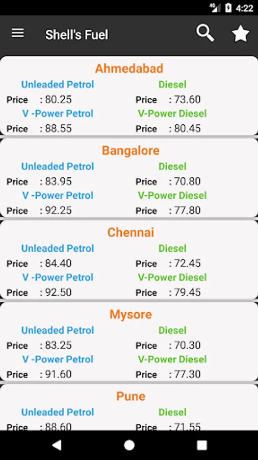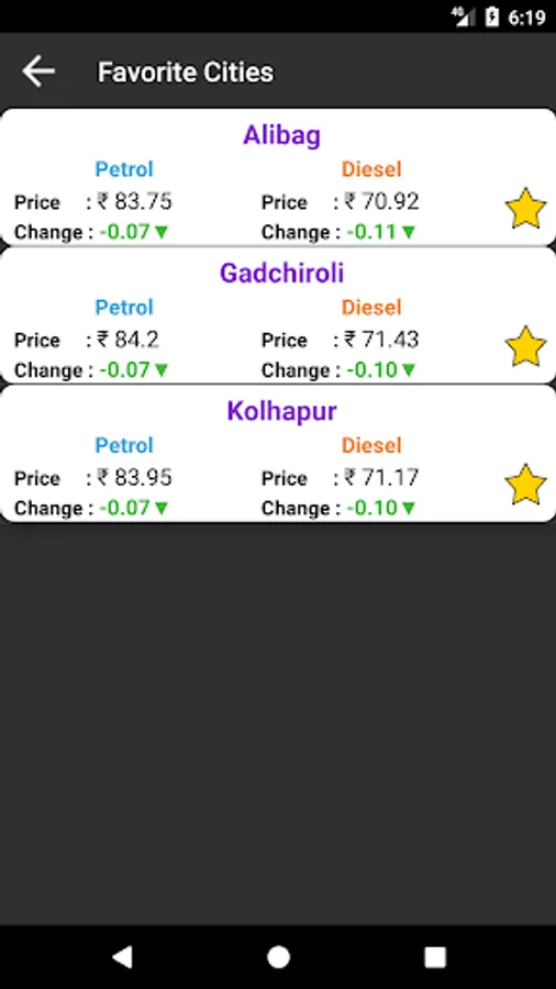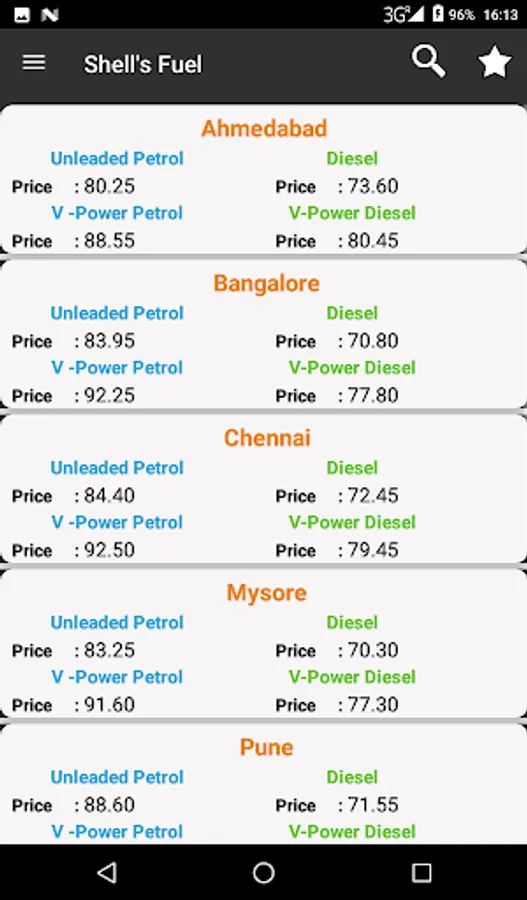 Petrol and Diesel price in your cities selected as favorite shows on the home screen it self. You don't need to go and look for it every time.
