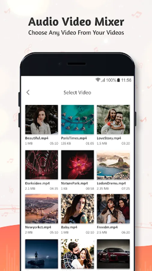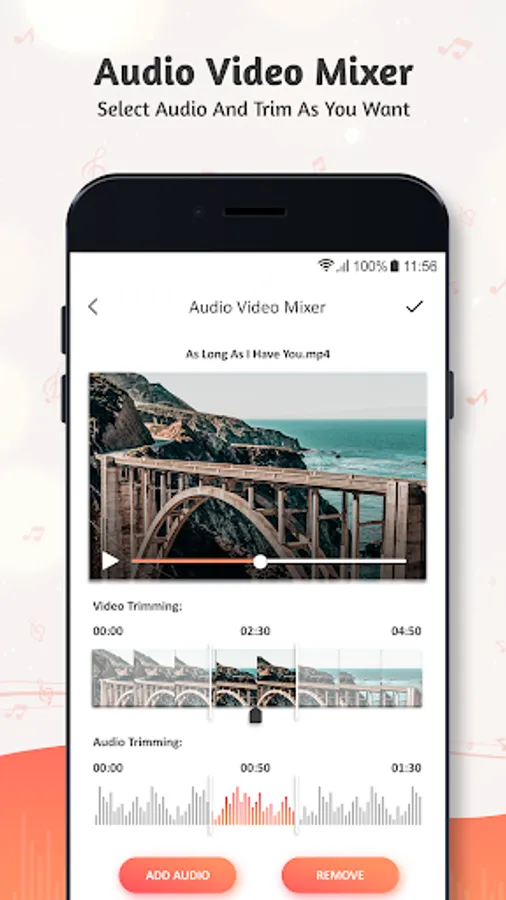 Audio video mixer. Select a background music for your video, using this video mixer with audio and audio video mixer hd app, or audio video mixer software, which is one of the best audio video mixer apps.