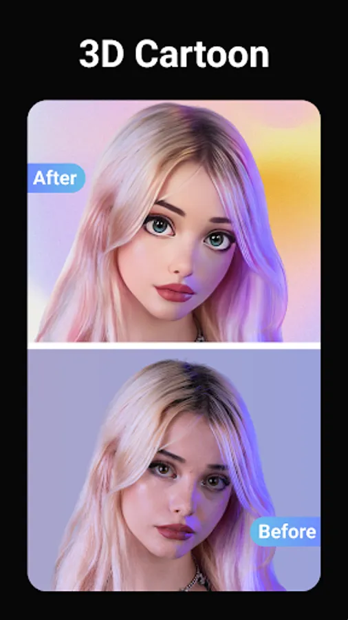 Turning yourself into cartoon character just need 3 steps: 1. choose cartoon AI effect style you like, 2. choose selfie you want to make, 3. voila, your tooned masterpiece is done! Easily turn your photo into your favorite 3D cartoon style with one button. Join the cartooned group and have fun by sharing your anime avatar on social media platforms like Instagram or Facebook. 💓💓
