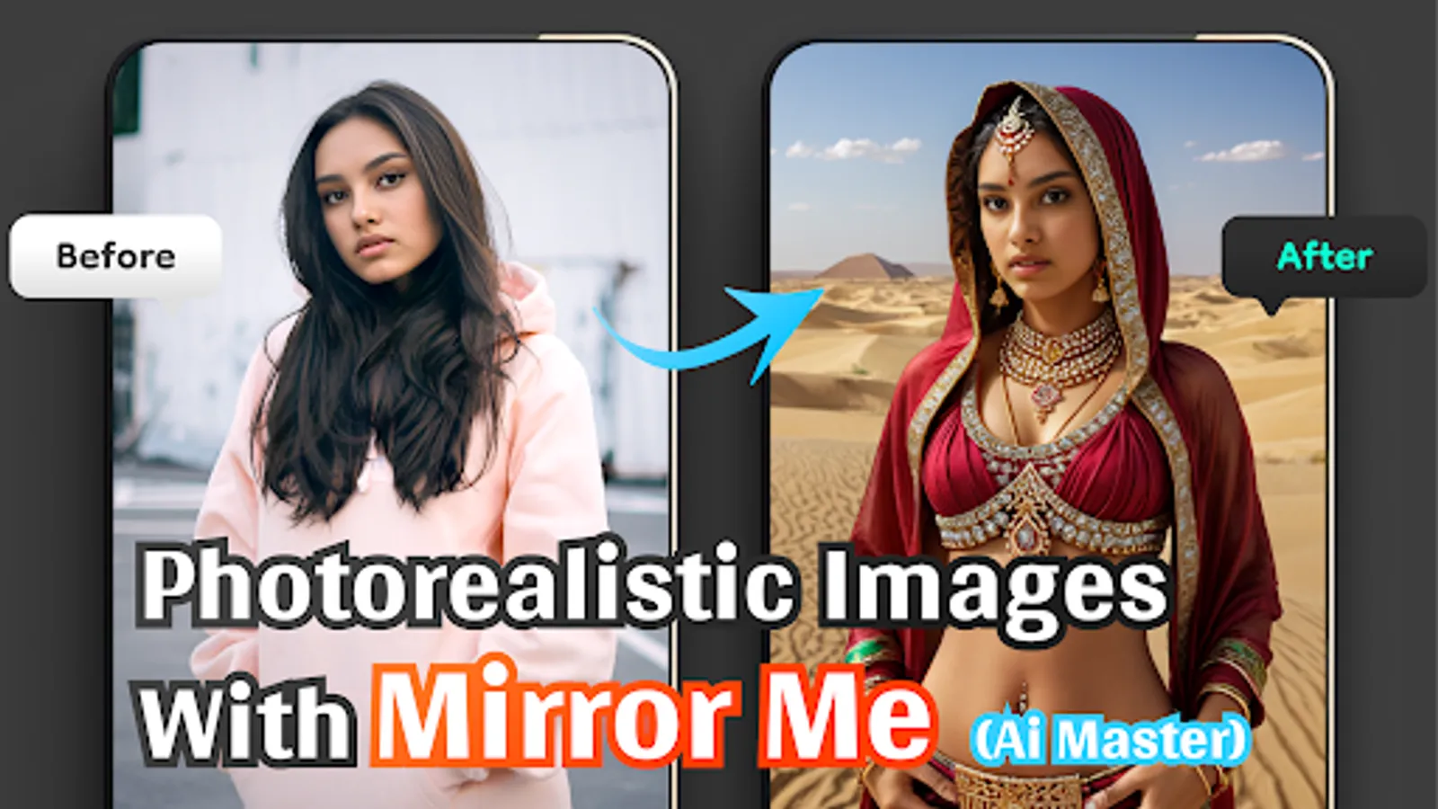 Mirror Me App is not just an ordinary photo editing software. It uses cutting-edge artificial intelligence technology to automatically recognize your facial features and body posture based on the uploaded photo, seamlessly integrating them into the generated photos to make them look very realistic.