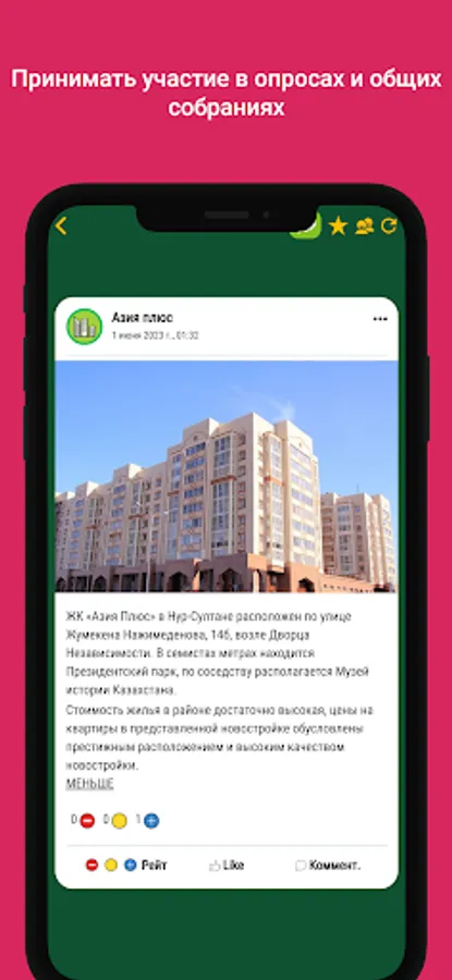 With the help of the LCD Asia plus application, you can send requests for the maintenance of your apartment, transfer meter readings, take part in surveys and general meetings. No more trips to offices or wasting time on long phone calls. All the necessary functions are right on your mobile device.