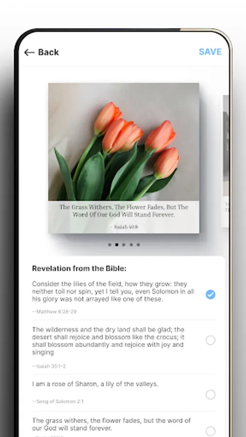 With just a few taps, you can choose a photo from your album and our app will pair it with a powerful message from the Bible.