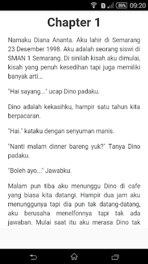 The story of Diana Ananta in finding the real meaning of love. Is his heart still choose Dino's status as a girlfriend, but less attention to him? Or is her heart instead will turn to Roy, who only existed as a friend yet attentive on Diana? Download this novel to find out who would choose to be his girlfriend Diana?